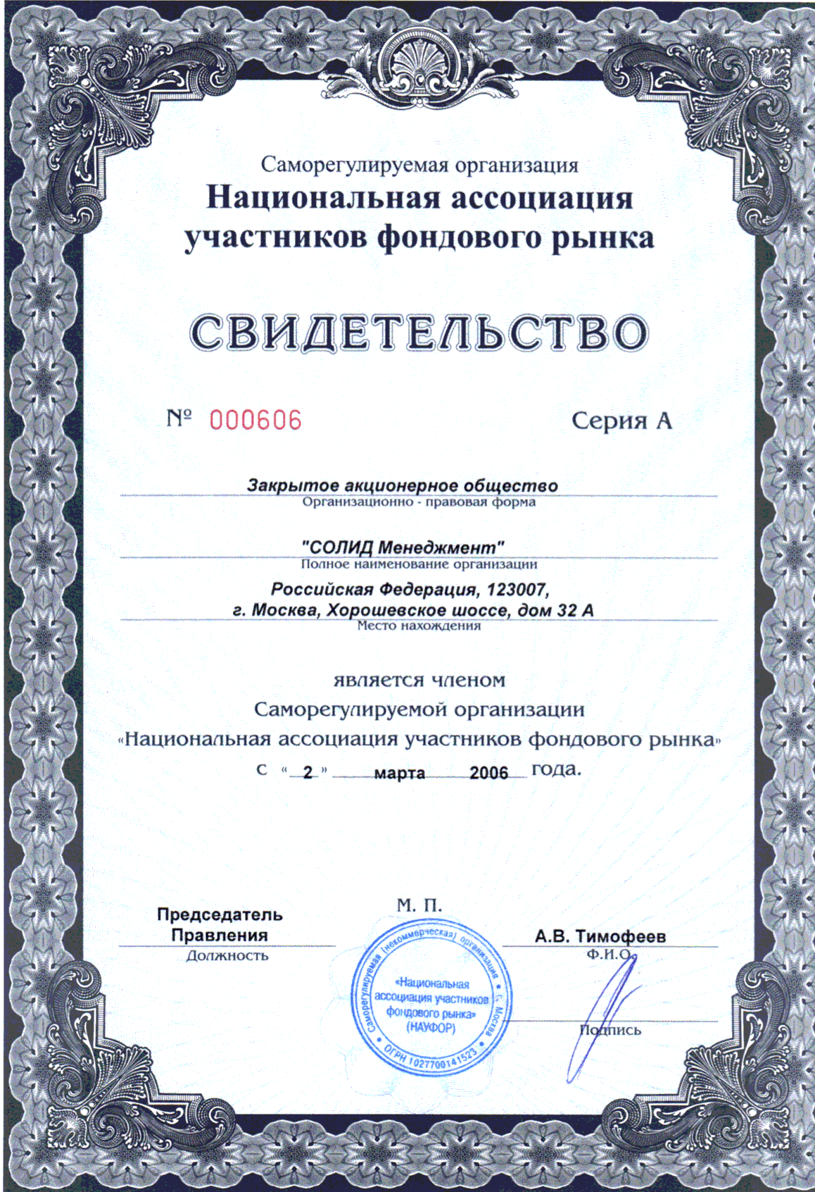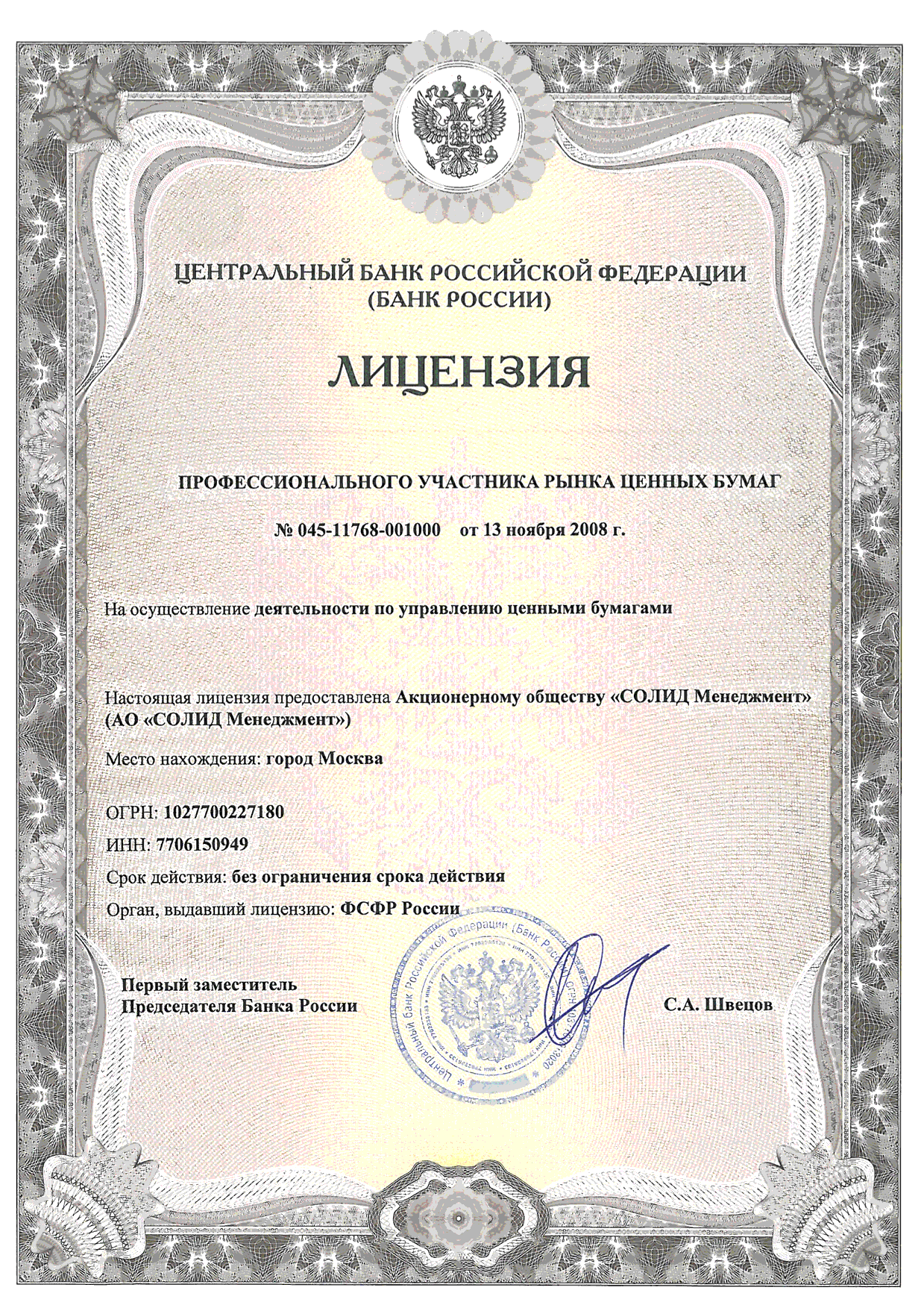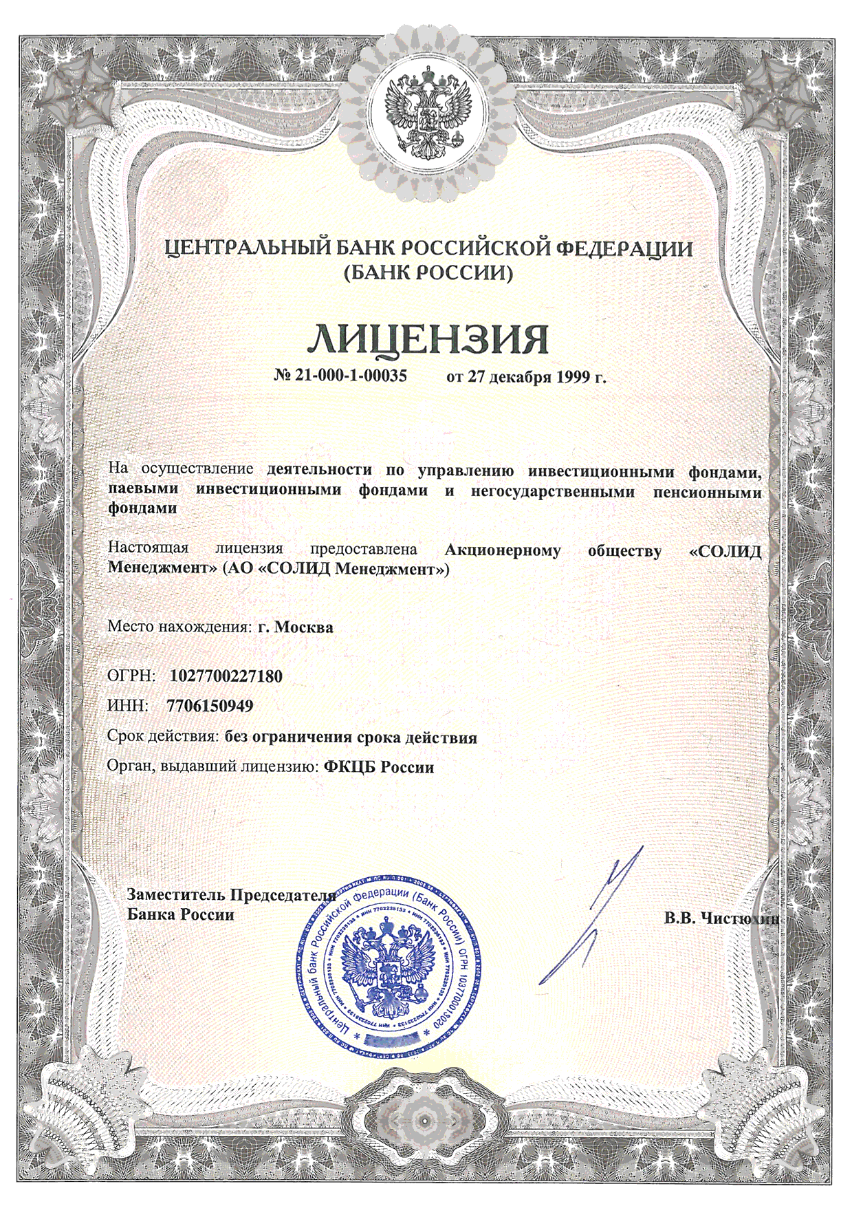 https://solid-mn.ru/upload/auto/258b210d5e0436025e125e9de24b353b88d7192e.pdfЛицензия ФКЦБ России № 21-000-1-00035 от 27.12.1999 на осуществление деятельности по управлению инвестиционными фондами, паевыми инвестиционными фондами и негосударственными пенсионными фондами.