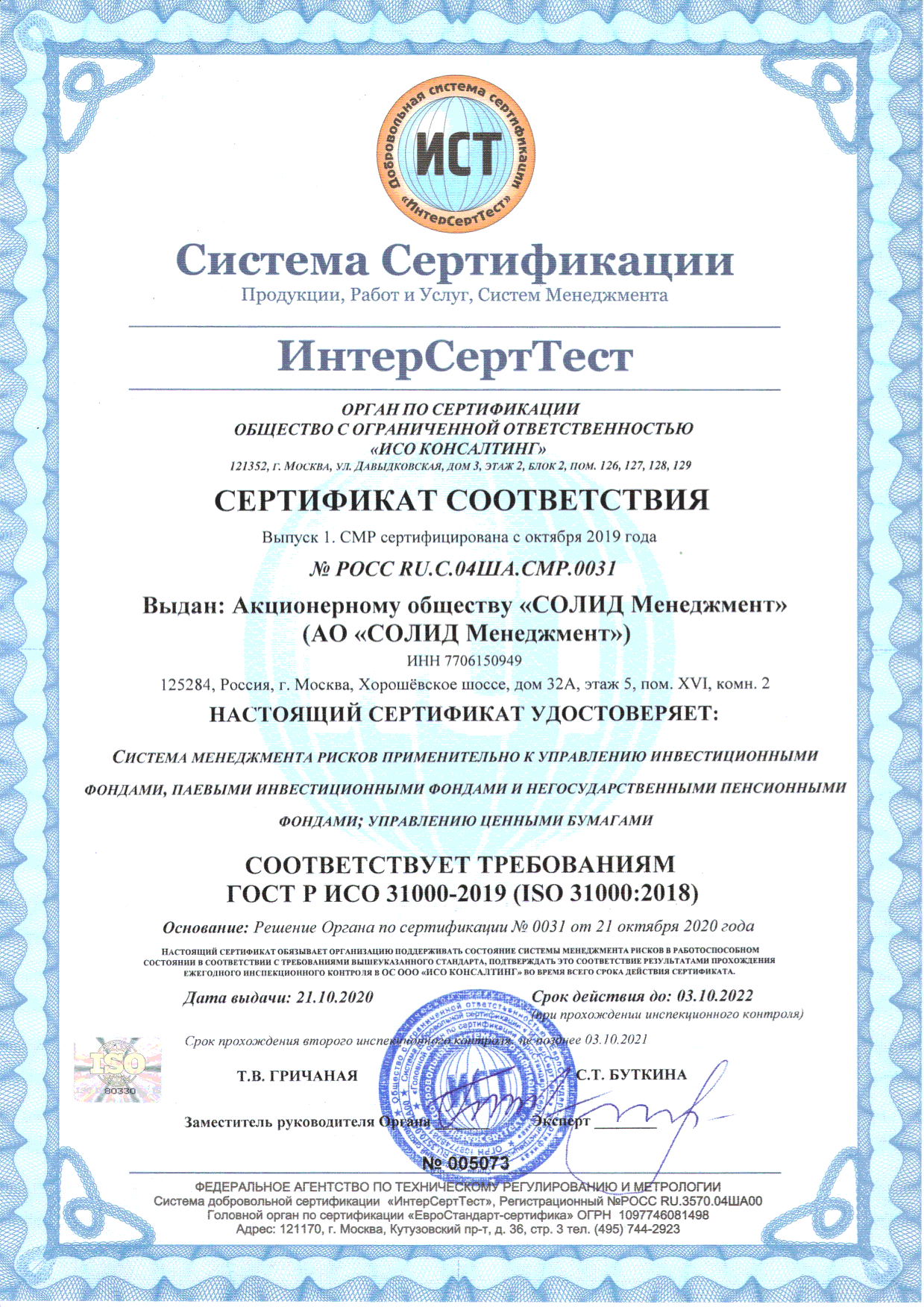 Правила доверительного управления ОПИФ рыночных финансовых инструментов «Солид – Инвест» зарегистрированы ФКЦБ России 20.03.2000 № 0040-52697973. Правила доверительного управления ОПИФ рыночных финансовых инструментов «Солид – российские облигации» зарегистрированы ФКЦБ России 27.04.2002 № 0065-58549452. Правила доверительного управления ОПИФ рыночных финансовых инструментов «Солид – пенсионный капитал» зарегистрированы ФКЦБ России 20.09.2000 № 0045-54859434. Правила доверительного управления ОПИФ рыночных финансовых инструментов «Солид-Индекс МосБиржи» зарегистрированы ФСФР России 20.04.2005 № 0351-76578546. Правила доверительного управления ОПИФ рыночных финансовых инструментов «Солид – Глобус» зарегистрированы ФСФР России 09.09.2010 № 1903-94169099. Правила доверительного управления ЗПИФ рентный «Солид Недвижимость-2» зарегистрированы ФСФР России 29.09.2011 в реестре за №2209-94178425. Правила доверительного управления ЗПИФ недвижимости «Солид Рентный - 2» зарегистрированы Банком России 26.12.2017 в реестре за № 3444.